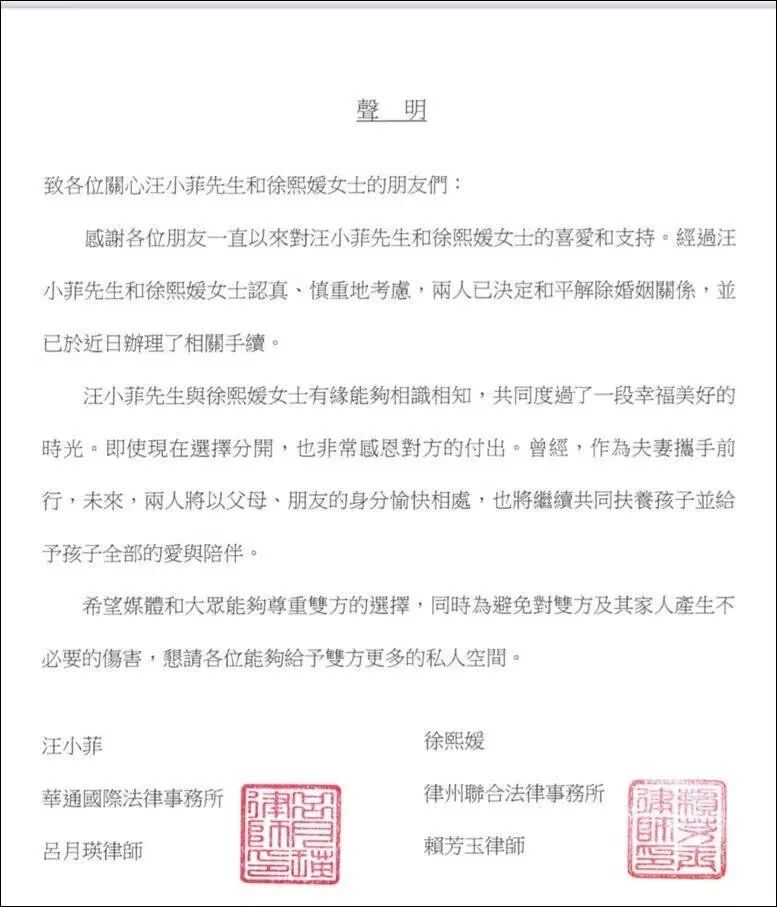 ▲ 大S与汪小菲的离婚声明。图 / 网络