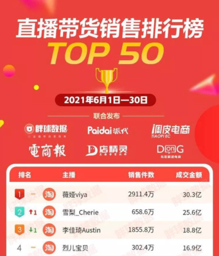 ▲ 6月带货榜单中,雪梨首次超过李佳琦,位列第二。图 / 网络