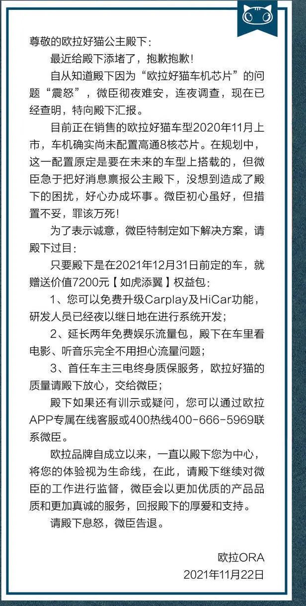 事件中最戏剧的一幕出现了:欧拉在声明中自称“微臣”,并称呼车主为“公主殿下”,而高通芯片“原定是要在未来的车型上搭载的,但微臣急于把好消息禀报给公主殿下,没想到造成了殿下的困扰,好心办成坏事”。