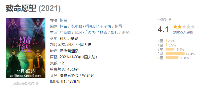 但让高管们寄予厚望的迷雾剧场,今年以低分收场,《八角亭迷雾》豆瓣5.7分,《致命愿望》4.1分,与去年相比可以说是惨烈。
