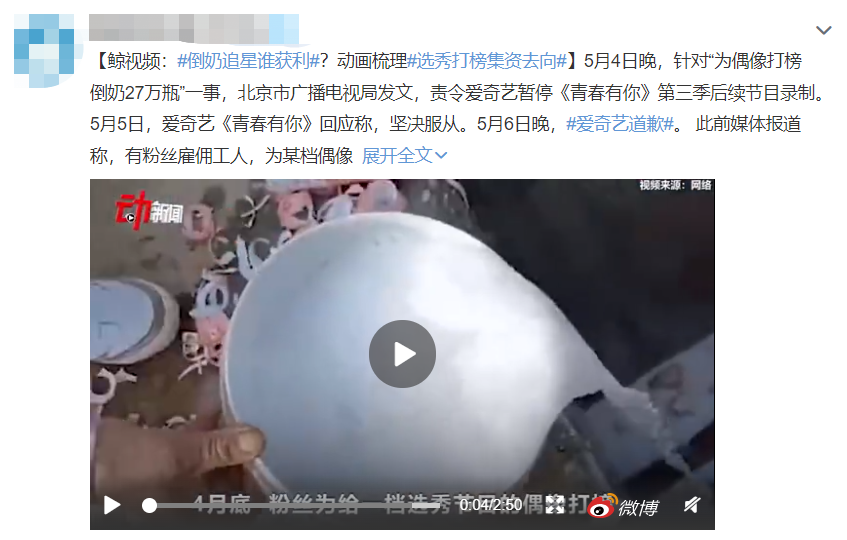 成箱的牛奶饮品被一群人剜开盖子,倒入沟渠。人们眼看着白花花的奶被倒掉,表情平静,在他们身后,还有一箱箱的牛奶在等待迎接相似的命运。今年4月,令人触目惊心的倒奶视频在社交平台上引燃了导火索,给“花钱买投票”的选秀节目画上了终止符。