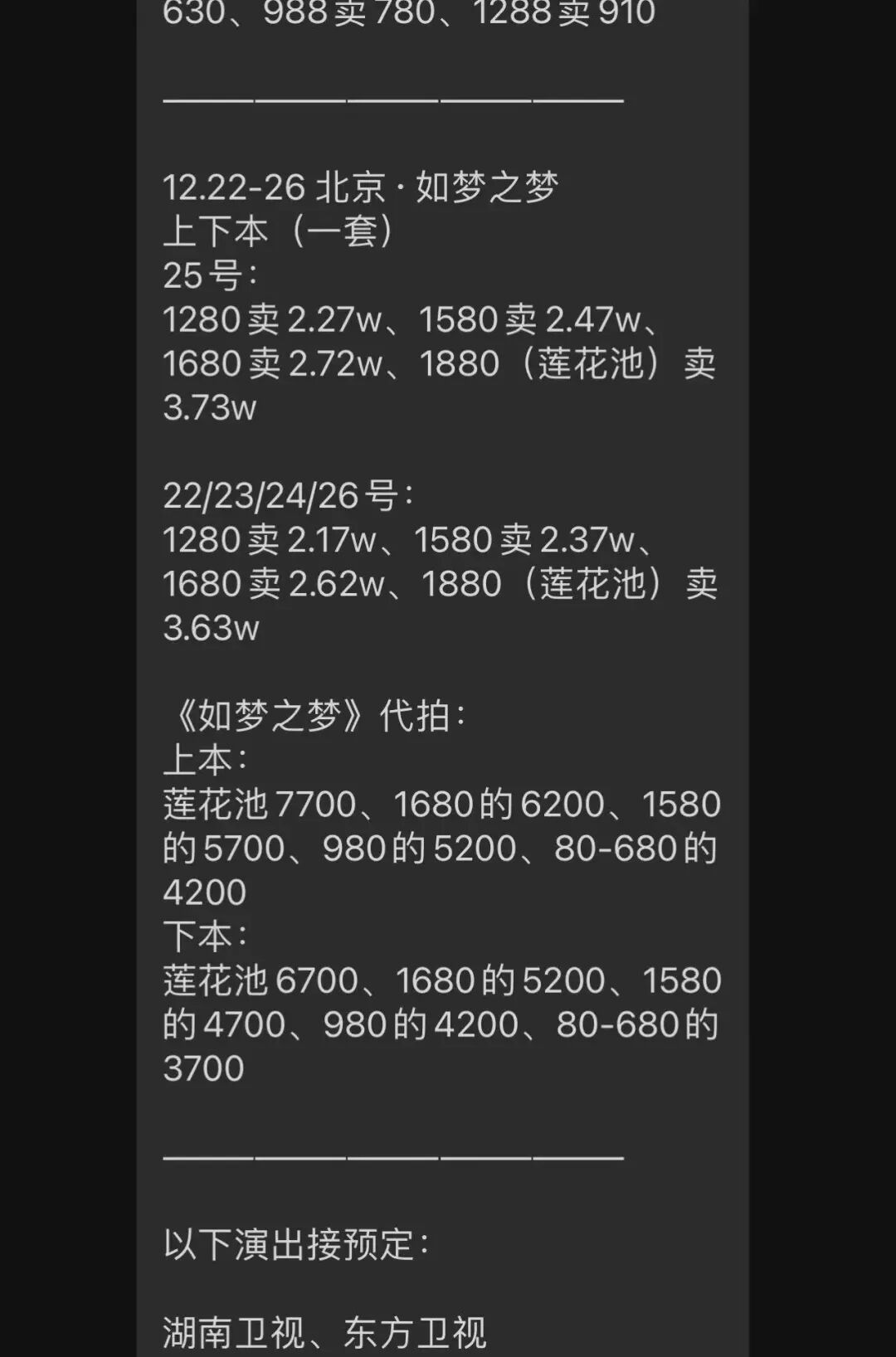 自从我加入各个黄牛群的那一刻起,就有一个名字频频出现在信息流里,《如梦之梦》。注意到它的原因,除了出现频次多之外,还因为他标价的方式与众不同。