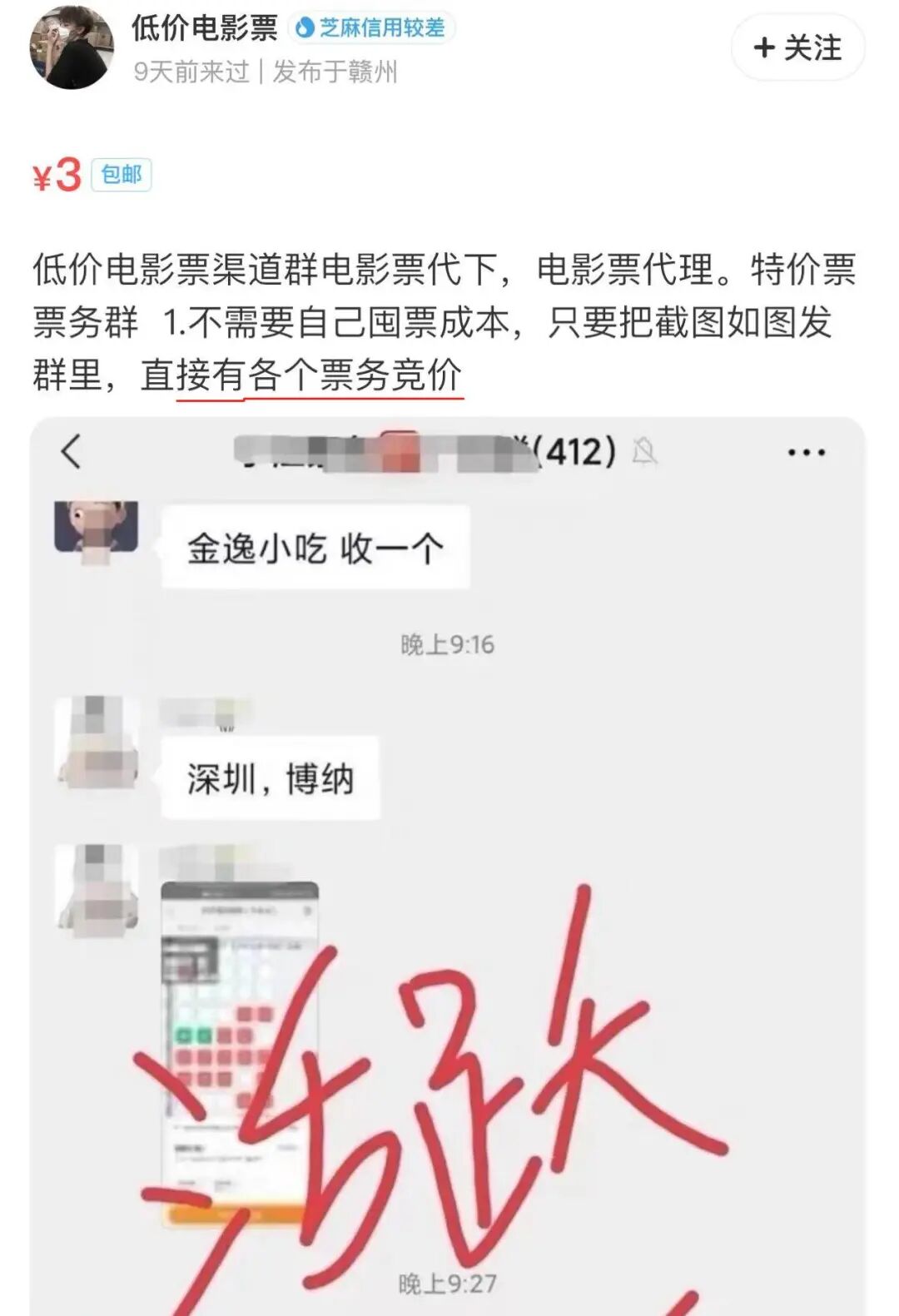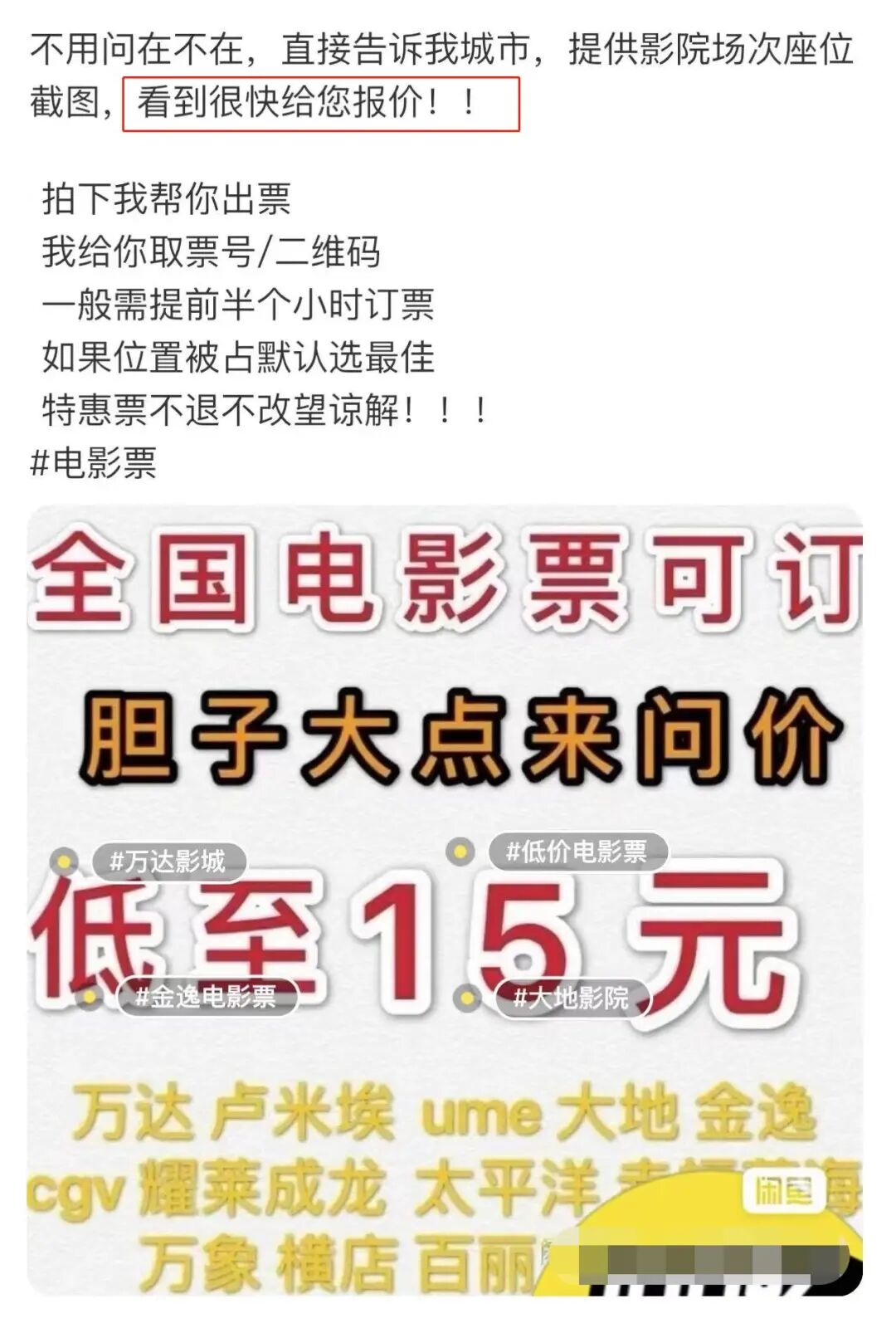 但也并不是所有的黄牛都过的这么好。我在搜索票务信息时,无意浏览到一条“电影票低价代理”的商品。点进去看了一眼,语气和我加入的明星黄牛完全不同,亲切里透着一丝卑微。