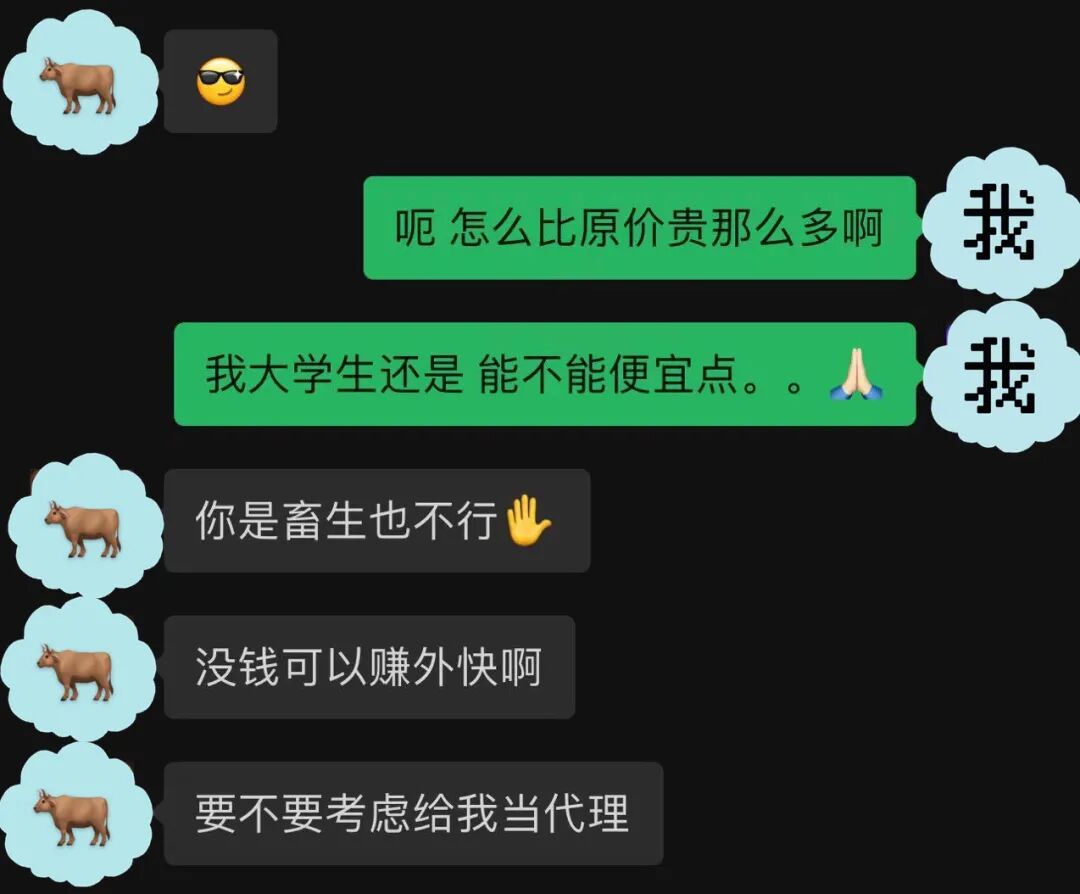 原来牛跟牛也不一样,最便宜的属于三级市场黄牛,基本都是底层牛,能给到的资源结算价经过上层黄牛的层层剥削后是最高的,油水最少;最贵的黄牛加盟属于掐尖一级市场,直接跟所谓的“工作室”合作,资源成本价更低,利润空间也相对更高。