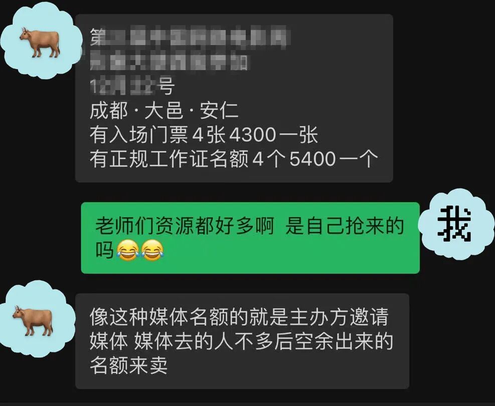 像“如梦”这样的资源来源对方没有回答,但很多媒体现场的名额,都是活动方邀请各家媒体时,媒体空余出来交易的名额,媒体开价,黄牛在此基础上加价卖出。