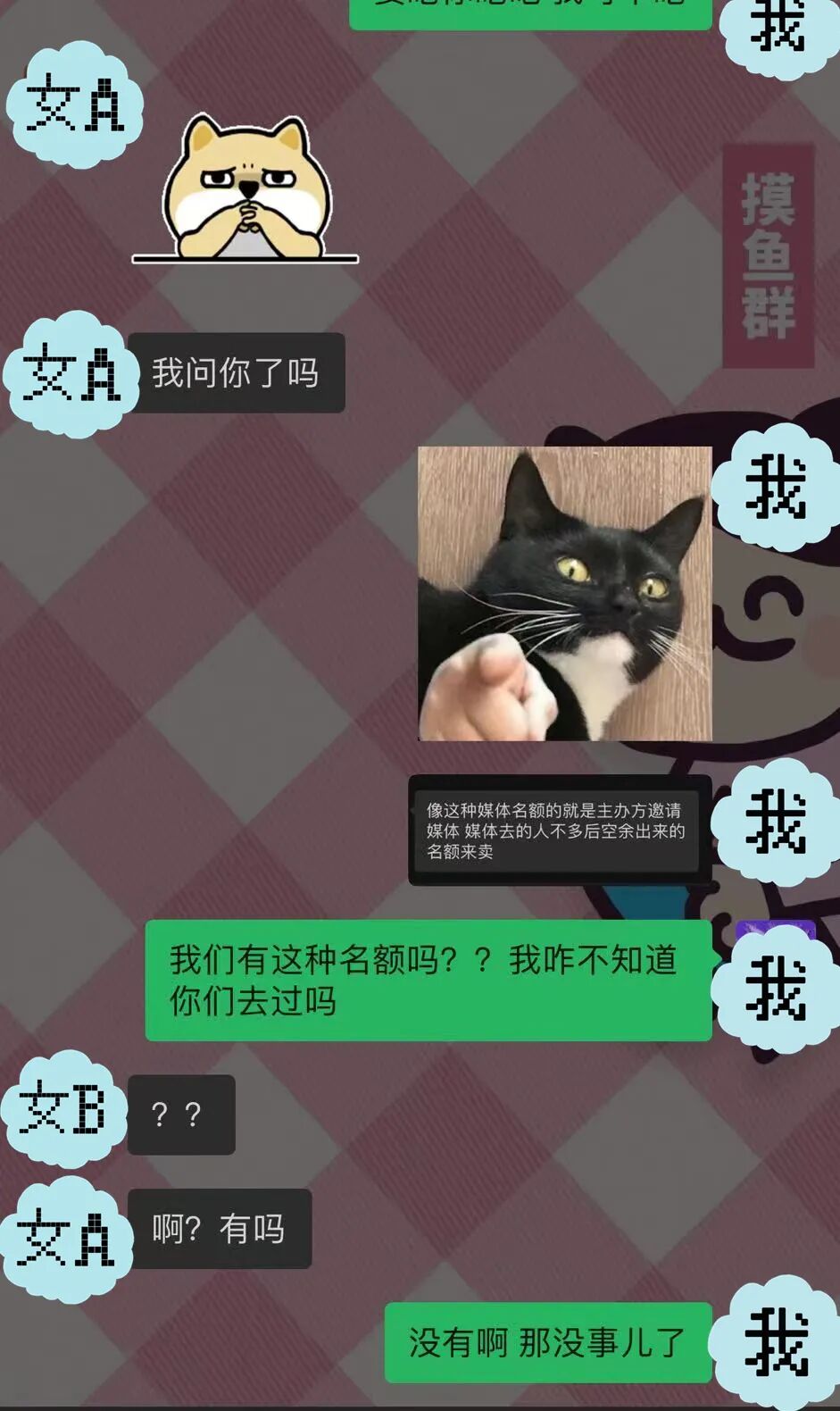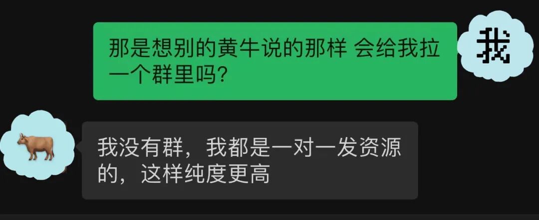 由于害怕自己常用的卧底账号被识破,我以没踏出心里害羞的那一步为理由推脱了,对方说那让我先到群里见习一下,同时也看看她朋友圈的资源有没有感兴趣卖的。
