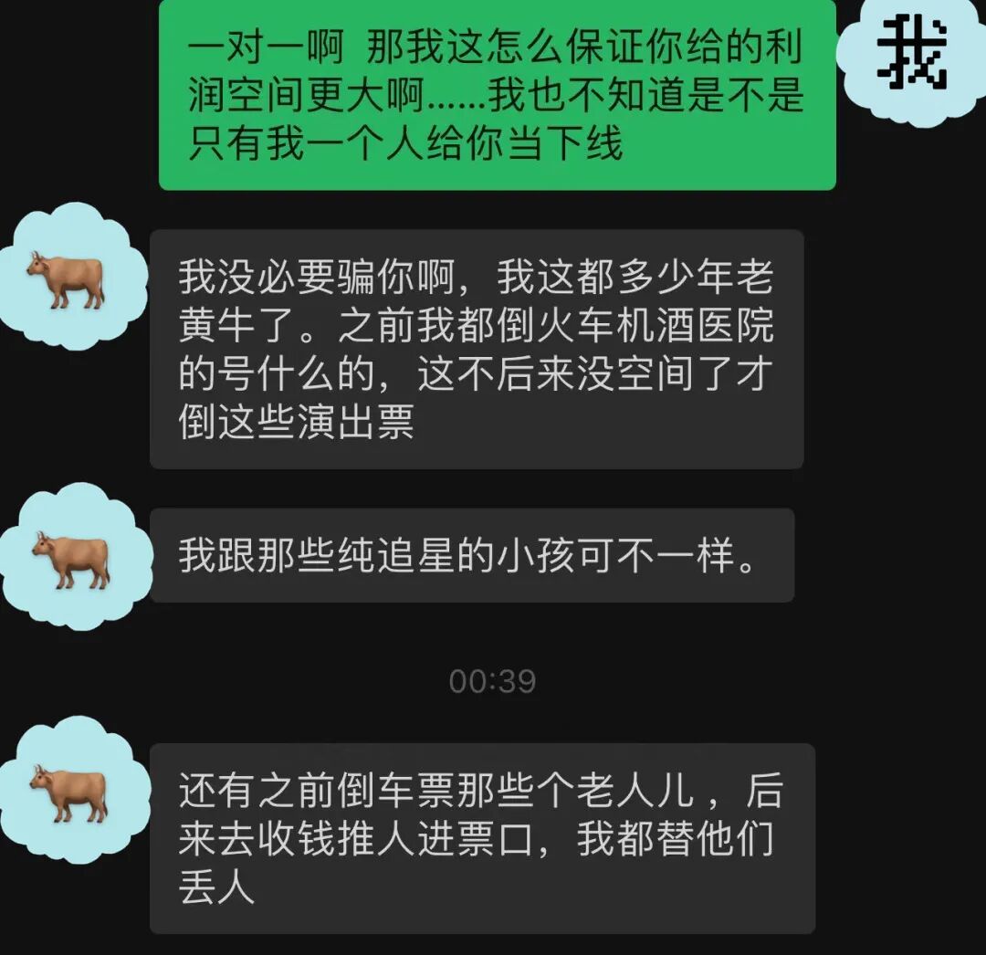 但越黄的牛骗人越狠,我并没有听信他的一家之言,而是又额外找了100元档和200元档两位黄牛上线作为对照组,正式成为一名见习牛犊。