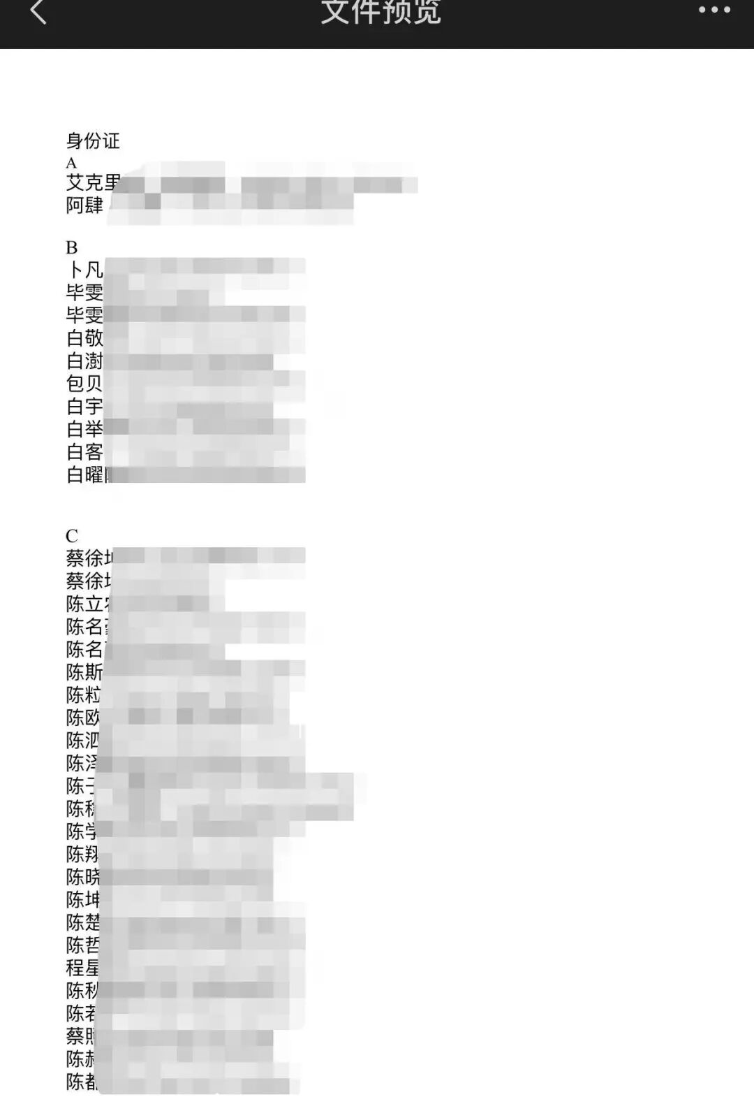 文档内是一个明星的身份证号大全,还亲切地按照姓氏拼音首字母分类排序。一些使用艺名活跃的明星后面,还会注明TA的本名。(PS:非法获取他人身份信息属于违法行为,售卖明星航班信息已有被抓案例。每日人物在收到留证后已销毁相关记录。)