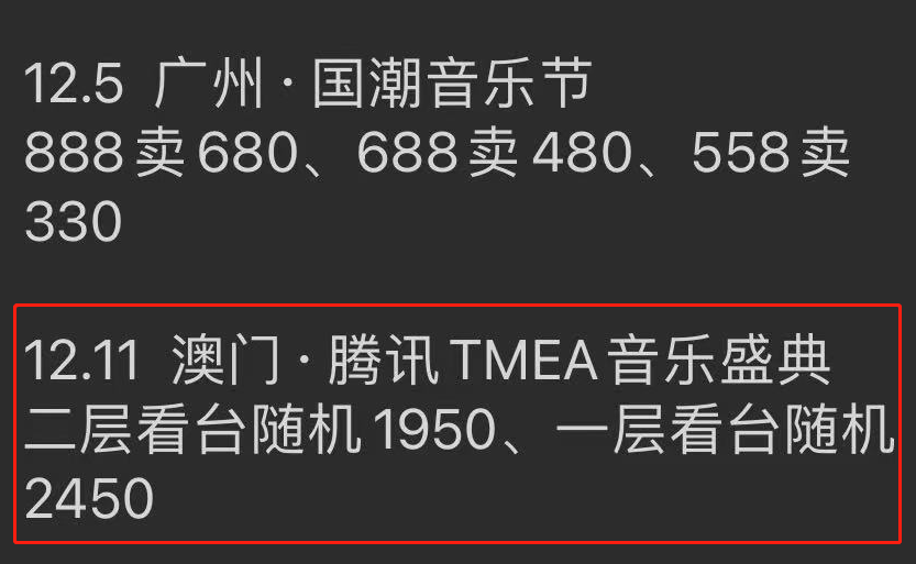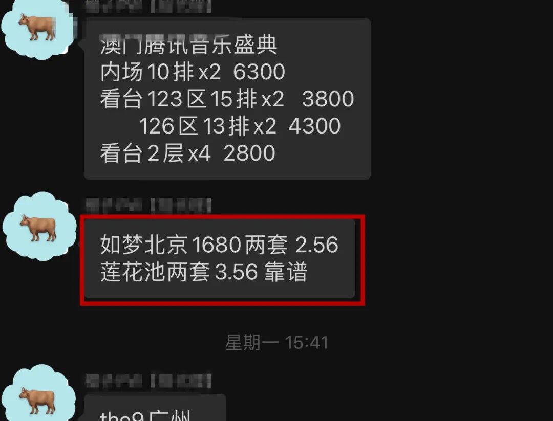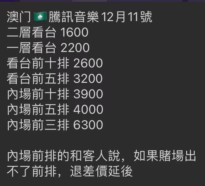 此外,相同活动场次的票价,也会根据黄牛等级高低而有所差别,比如腾讯音乐在澳门的活动票价,三级市场黄牛给到的价格不仅更高,选择还少;而高级一些的黄牛价格更低,可选位置也多。
