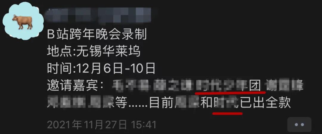 我打开了两个群扫了一眼聊天记录,也去群主的朋友圈刷了一波后,发现了个有趣的现象。其中一个群内,群主发布了一条某视频网站跨年夜录制的信息,称某个男团“不去”。
