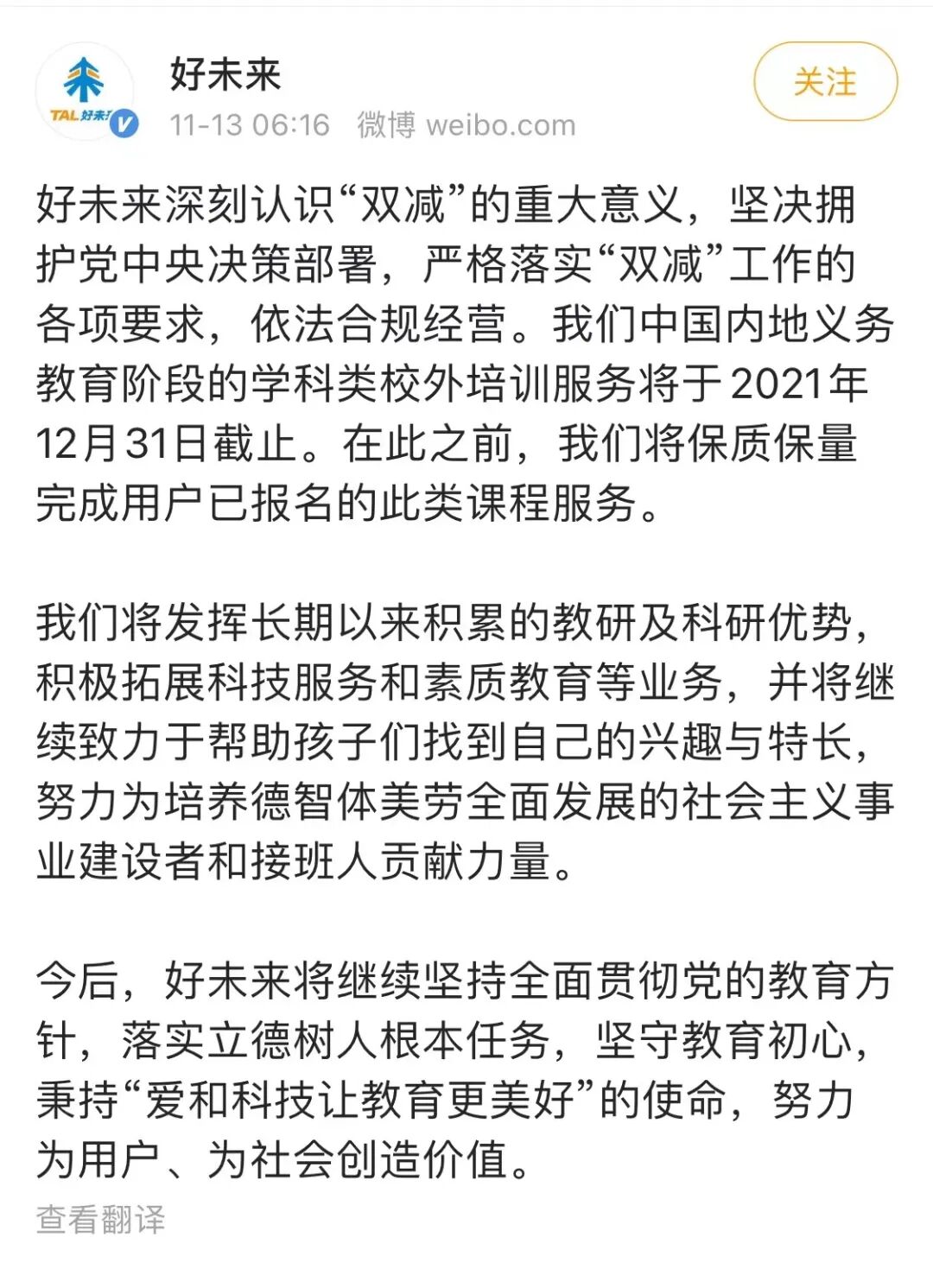 ▲ 好未来此前宣布将转型素质教育。图 / 好未来官方微博