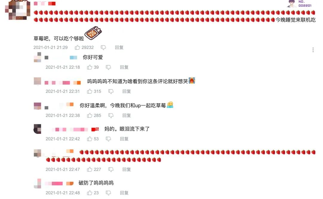 年轻人孤独死去的故事,足以让大多数人共情。墨茶在B站上留下的一条“我老想吃草莓了”但“可惜草莓老贵了”的动态,直到今天已经累积了2.7万条评论,每天,都还会有几个网友在评论里再打出一串草莓。