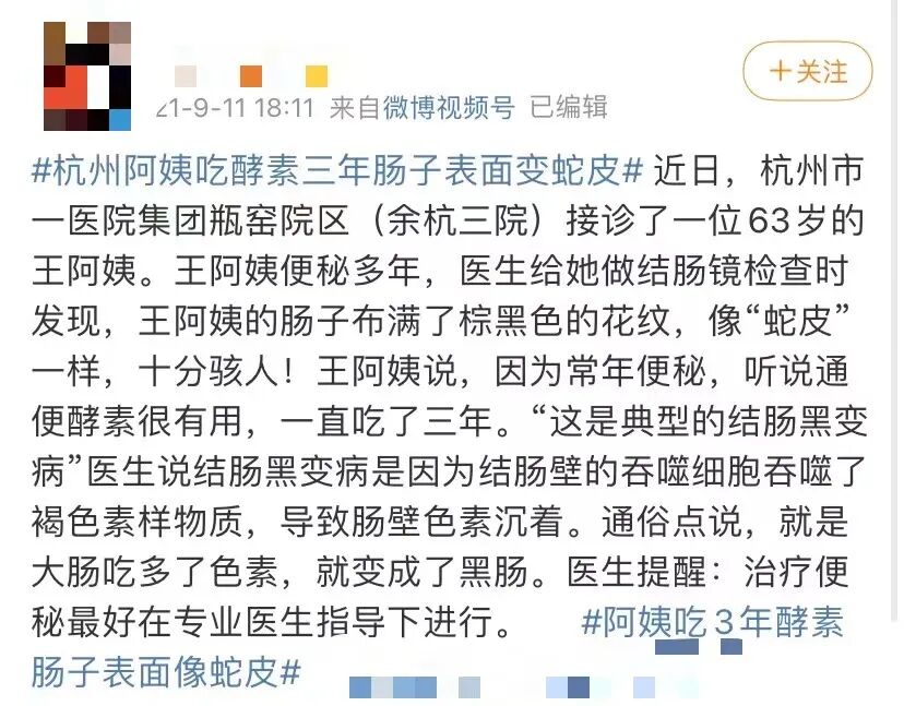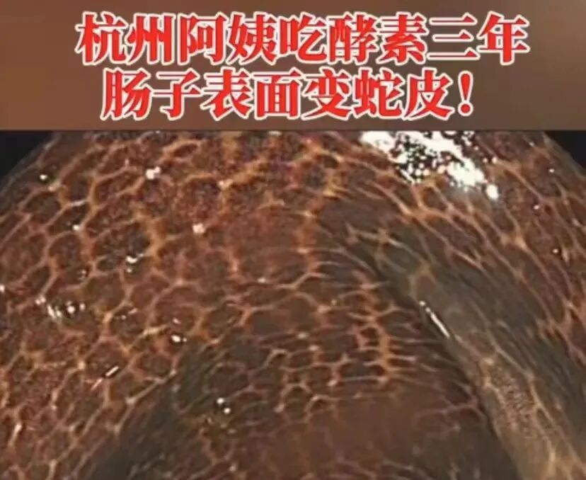 直到2021年9月,“阿姨吃3年酵素,肠子表面像蛇皮”的微博话题,成为热搜。当时的结肠镜检查结果显示,63岁阿姨的结肠表面布满蛇皮般的棕黑色花纹。
