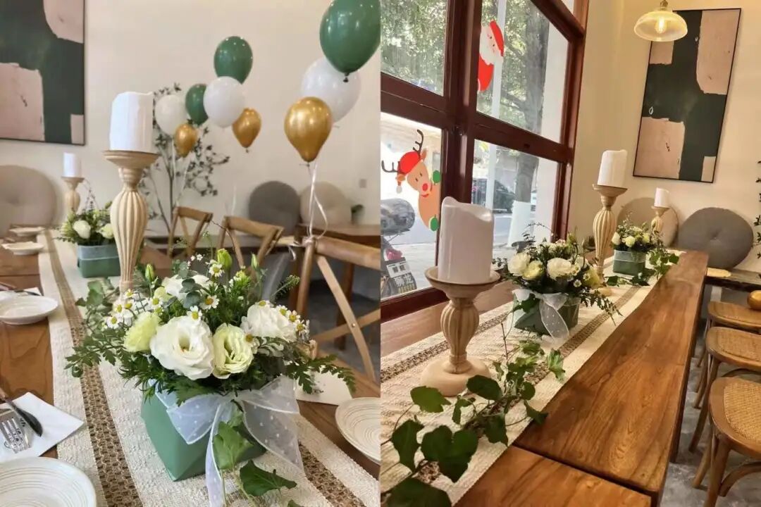 也有超出小丹想象的时候,她感觉木马食堂不仅仅只是一个吃饭的地方,也是县城年轻人渴望已久的文化、社交的空间,一个有生活仪式感的地方。有顾客主动找到小丹,想在她的店里举办家庭欢乐日。那天,食堂的氛围不同往日,也不像是在人们印象里文化贫瘠的县城:孩子的爸爸弹吉他,有人吹口风琴,大家一起唱起了周杰伦。婴儿在摇篮车里晃手,孩子和大人一起打节奏,桌上摆着气球、鲜花和蜡烛,旁边等位的人也跟着哼唱起来。