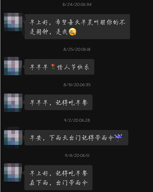 为了省下那几块、几十块折扣,余芊会暂时开通一下,买完东西赶快还上,然后关闭。但没想到,自己买的东西越来越多,明明都“不是很贵”,不知道怎么最后就欠了那么多。在刘雨看来,网贷让自己产生了“可以消费得起”的错觉,去购买那些原本可能无法拥有的东西——大家会把网贷平台的额度当成自己已经拥有的钱。于是,在“友好”之后,年轻人感受到了网贷的可怕。还完钱后,韩青冈依旧收到了来自各个网贷平台的短信,五万、十万的额度等着他去开通领取,数一数,有十几条。这让韩青冈想起了一个“小贷公司”的放贷员,自从加上这个人的微信,每天叫醒韩青冈的不再是闹钟,而是这位放贷员的问候。韩青冈形容那个人,“比你男朋友都热情”。在一张聊天截图里,每天早上6:20左右,放贷员都发来“早安”、“记得吃早餐”的信息,如果下雨了,会提醒他“出门记得带雨伞”,节假日还有专属问候,比如“情人节快乐”,跟在后面的才是最新的贷款“福利”信息。