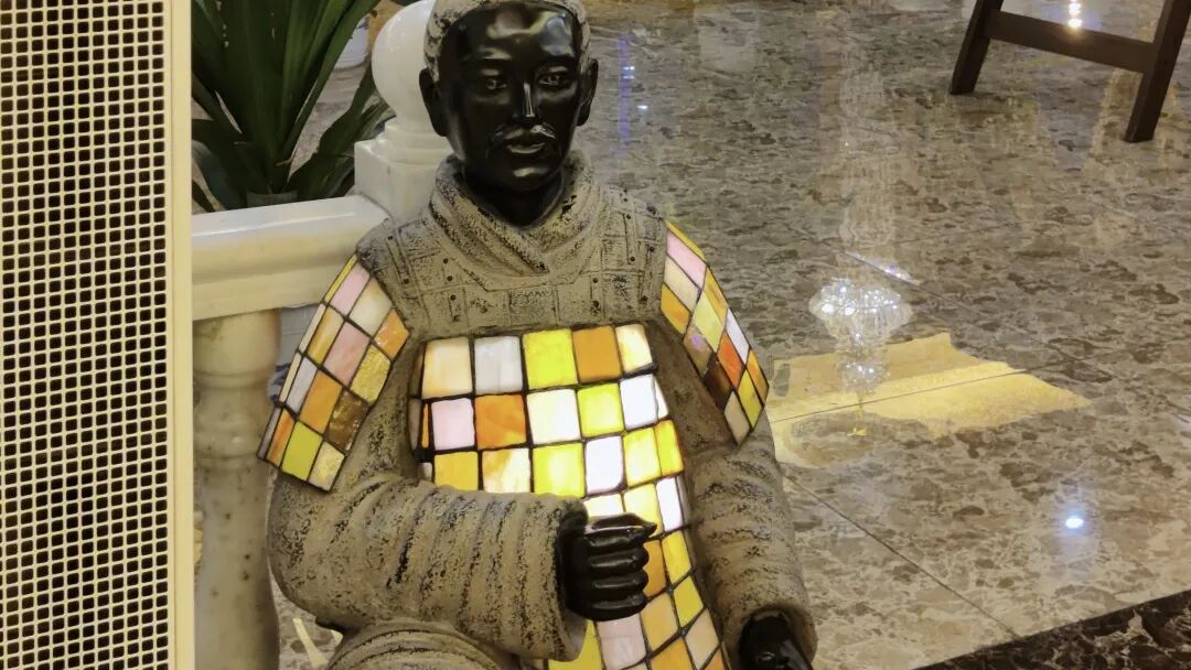 我踏进去之后忽然明白了,确实是复古风,因为跟现代人的审美毫无关系。在洗脚城门口,有两个斯巴达勇士拿着长矛,仿佛誓要守卫洗脚城。但一转头,迎接你的就变成了两个硕大无比的佛祖头像。 再往里走,竟然还有穿着霓虹灯块的兵马俑。
