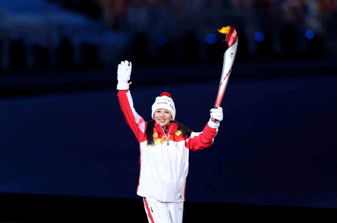 冬奥会开幕式上,穿着红白相间运动服的杨扬高举着火炬,从六边形的大雪花前跑过。