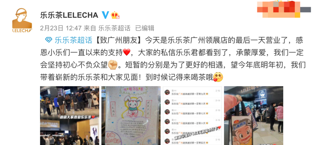 2月23日,乐乐茶通过官方微博官宣,广州领展店最后一天营业。这也是乐乐茶在广州以及华南地区的最后一家门店。乐乐茶对此回应称,暂时关闭其他地区门店,是为了集中精力聚焦华东市场,扎实自身基础。