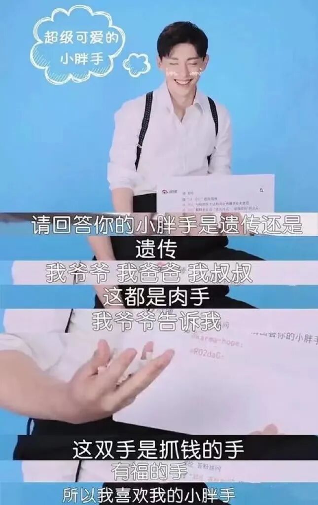 邓伦笑着回应说:“因为这是抓钱的手啊!”并表示,他的爷爷、父亲和叔叔一家子的手都是肉肉的,爷爷告诉他,这是抓钱的手、有福气的手。