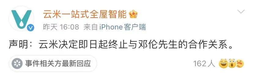 纳斯达克上市企业云米科技跑在了最前头。仅仅用了8分钟,这家公司就通过官方微博宣布“即日起终止与邓伦先生的合作关系”,哪怕账号背景图还是邓伦,哪怕两个小时前还带着这位“全球品牌代言人”预告春季新品发布会即将开幕。