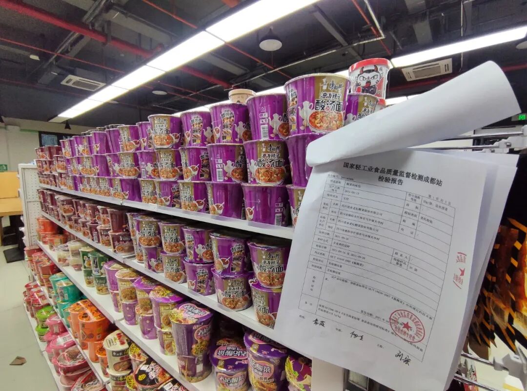 ▲ 西安一家便利店在方便面货架旁悬挂老坛酸菜方便面调料包的检验报告。图 / 人民视觉