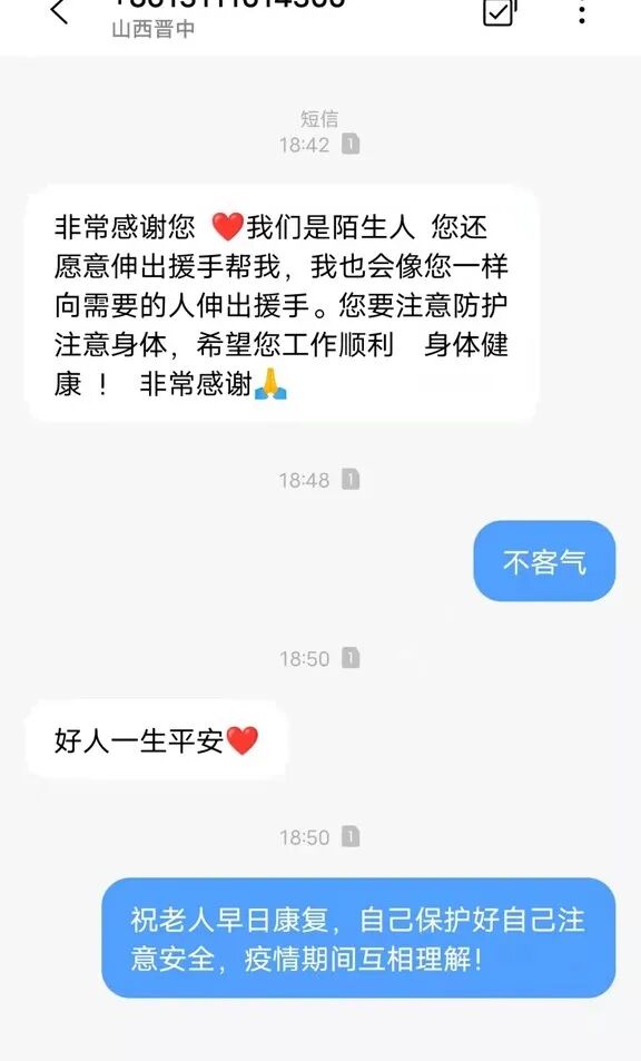 后来,她给曾召兵发去一条短信:“非常感谢您,我们是陌生人,您还愿意伸出援手帮我,我也会像您一样向需要的人伸出援手。”她也不忘嘱咐曾召兵注意安全,“您也要注意防护,注意身体,希望您工作顺利,身体健康!非常感谢。”