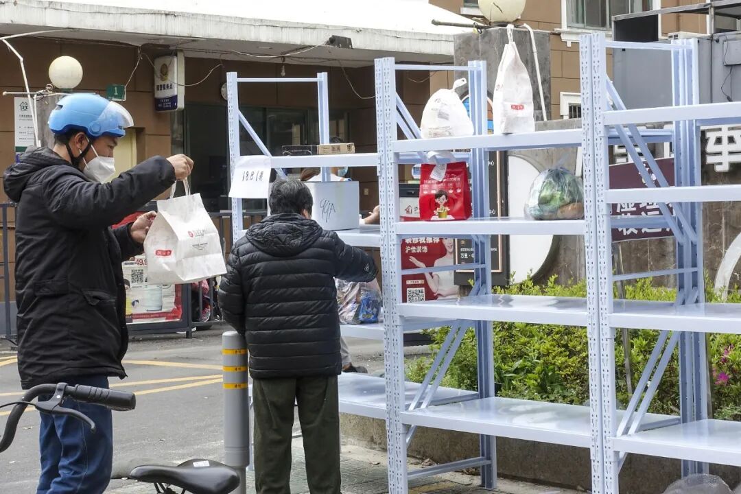 ▲ 疫情防控要求下,外卖员只能将餐食放在置物架上等候居民自取。图 / 人民视觉