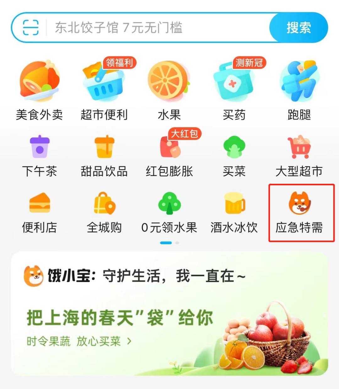 ▲ 饿了么开通“应急特需”通道。图 / 饿了么截图
