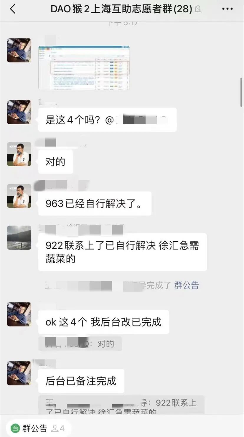 进群以后,我发现很多女团长和志愿者正在帮老人们团菜,她们发起一个腾讯文档,每个人对接几位老人,谁有什么需求,直接写在文档里,每个人都可以编辑、修改。我觉得不可思议,传统的互联网产品是审核制,不能让游客乱发东西,但这个文档没有任何限制,就算真有人写错了,还会有人再帮忙改回来,而且几乎没有任何一个人出错,每个人都非常精准地解决了自己负责的那部分的问题,没有让任何一个人挨饿。