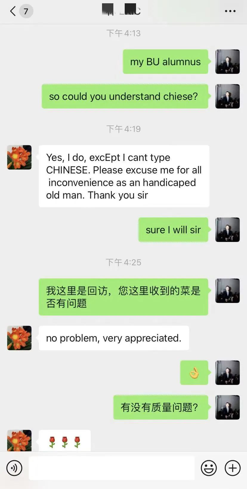 前两天,还有一位老人的家属联系到我们,让我们帮忙送菜。老人是个上海“老克勒”,耳朵听不见,不能接电话,视力也不是很好,他的手机被人不小心调到了英文模式,不知道怎么调回来。我加上他微信之后,他全程给我发英文。所幸,最后菜送到了。