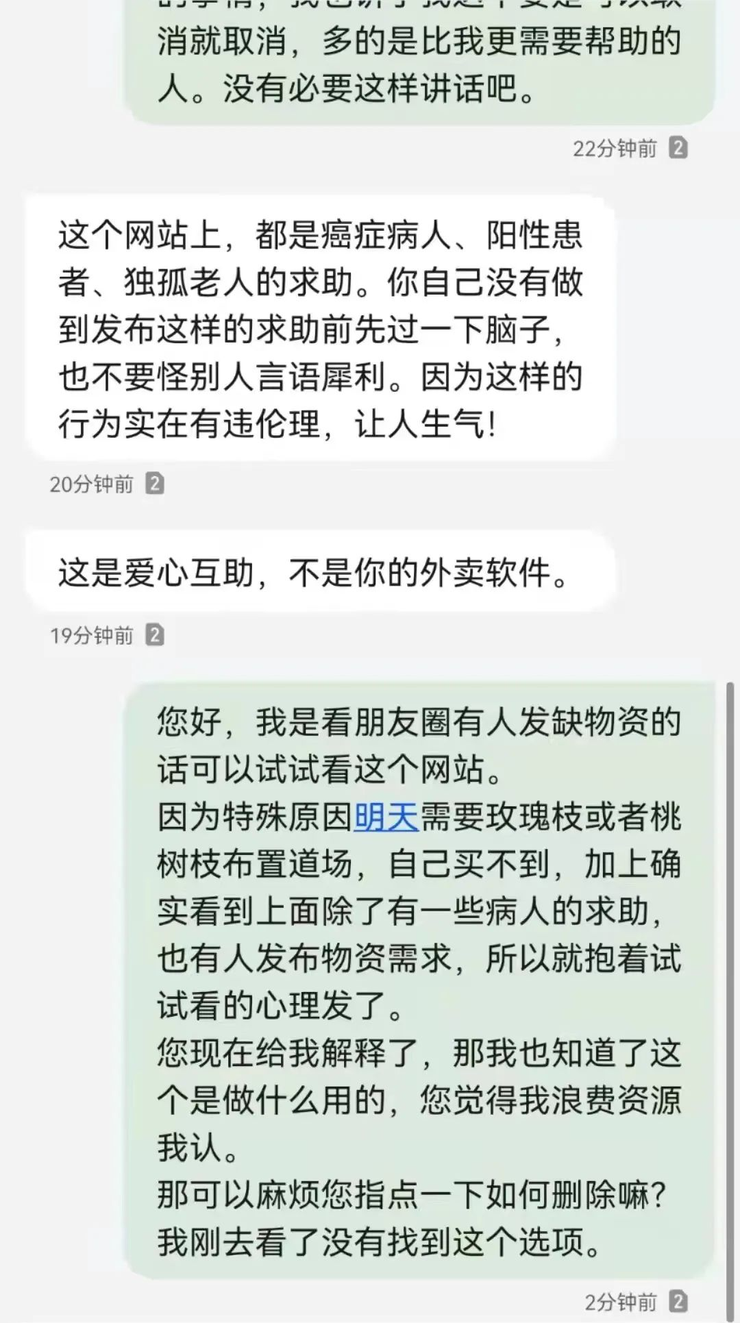 原来,她在上面发了一个求助消息,说自己想要10朵玫瑰花。在她那条求助的上面,有人是癌症晚期,急需药品,下面,是有人吃不上菜,需要物资。大概有三四个人发短信告诉她,在这样紧急的求助里说自己想要玫瑰花很过分,希望她不要占用公共资源。