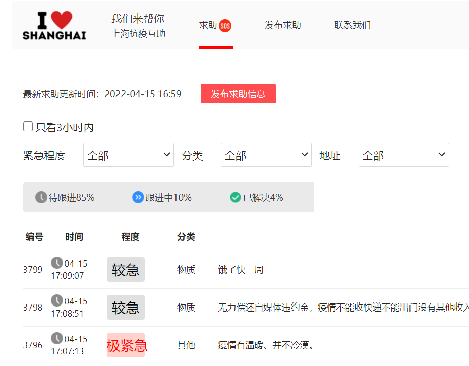 在这个互助网站上,每个人都可以写下自己的求助信息、联系方式,标注出紧急程度,志愿者或普通人看到后,能主动联系,提供帮助。截止4月15日,共计有4216位发布了求助信息,其中7%已解决,53%跟进中,39%处于待解决状态。