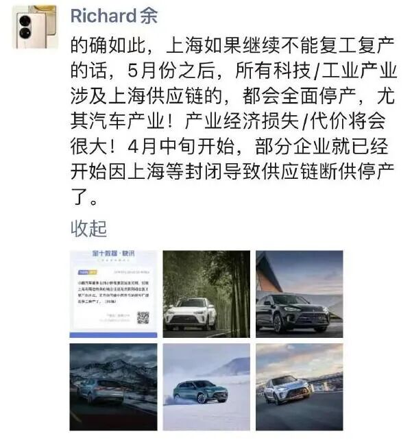 这个观点得到了华为消费者业务CEO、智能汽车BU CEO余承东的附议,他预测的停产范围,扩大至“所有科技/工业产业涉及上海供应链”的公司。