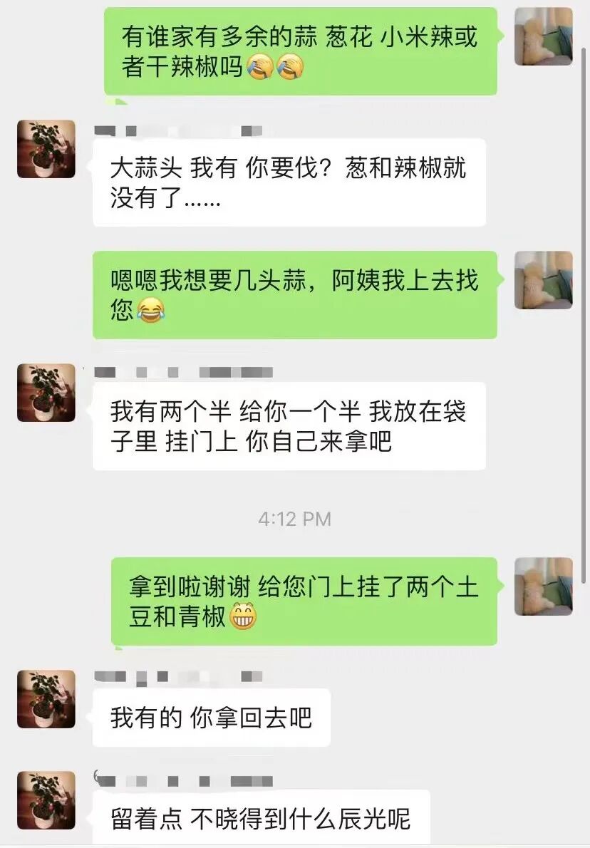 在这之前,米米从不做菜,厨具也没有,现在她不得不自己做饭。当然,厨具也都是借的,徐阿姨将自己的锅、炒勺、调料都借给她用。食材也是借的,在一个20多人的居民群里,她问大家有没有多余的蒜、葱花和辣椒。“大蒜头我有,你要伐?”楼上的阿姨热心回应她,“我有两个半,给你一个半,我放在袋子里,挂门上,你自己来拿吧。”米米在阿姨门上挂了两个土豆和青椒,对方让她拿回去:“留着点,不晓得到什么辰光呢。”
