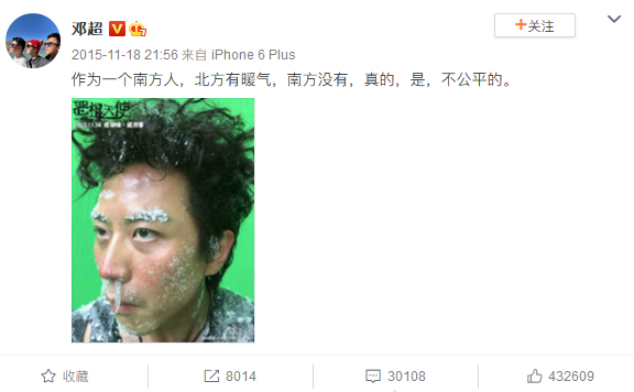 ▲ 邓超曾经在微博上表示“北方有暖气南方没有,真的是不公平”。图 / 微博截图