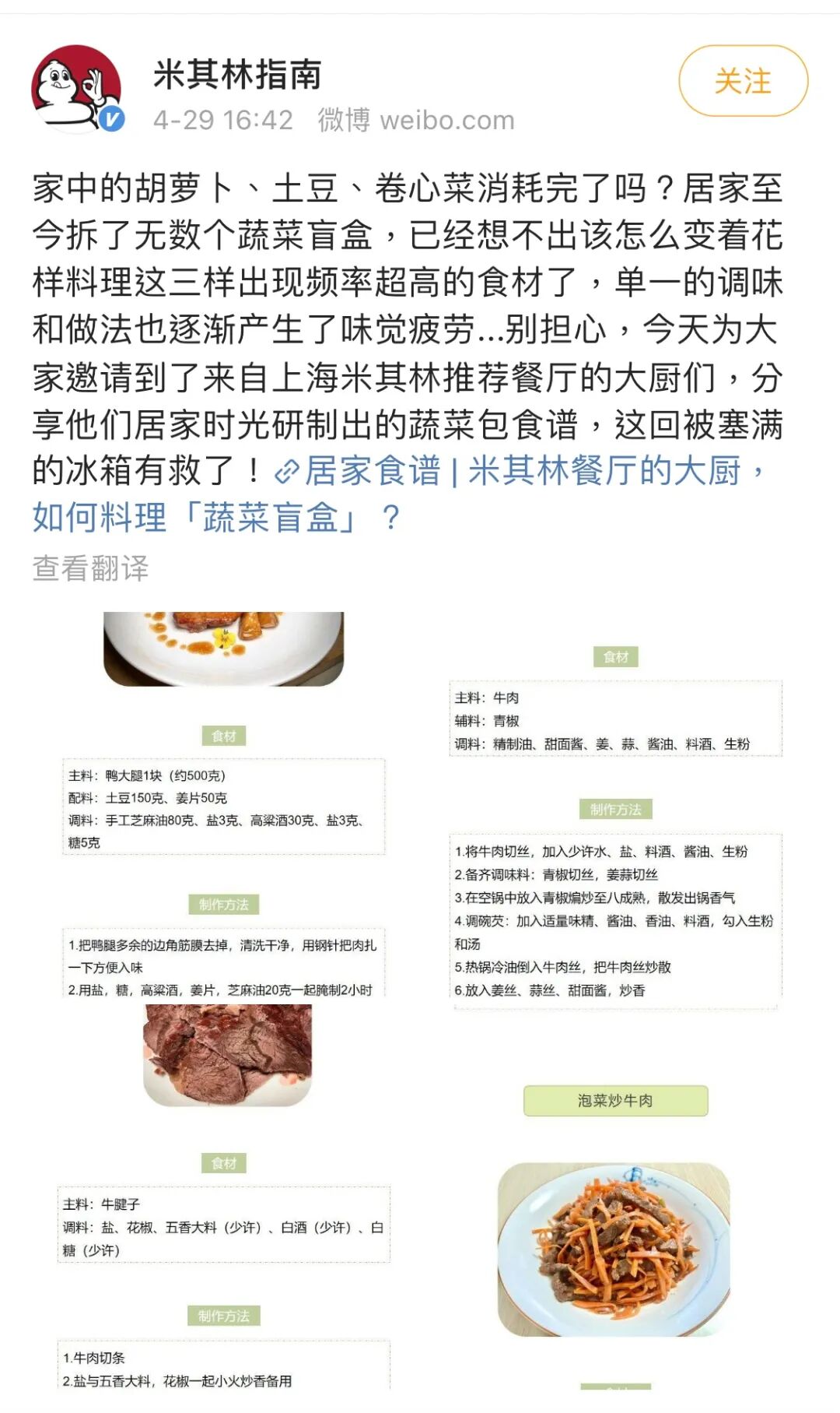 ▲ 疫情期间,上海米其林餐厅推出居家食谱。图 / 微博@米其林指南