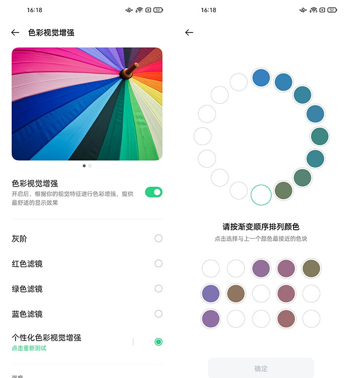 方雨此前做过各种类型的色弱色盲测试,但在手机上排列色棋还是第一次,他觉得有点新奇。按照系统提示做完测试并设置后,手机屏幕呈现出和此前完全不一样的色彩。
