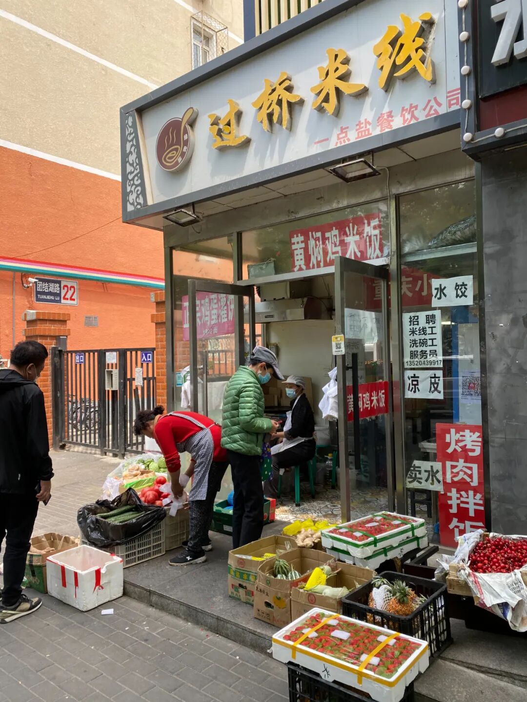 团结湖路的尽头,是一家过桥米线,老板崔国伟把餐馆变成一个小小的果蔬摊子,黄瓜、奶油草莓、羊角蜜,十几个品种都摞在门口。
