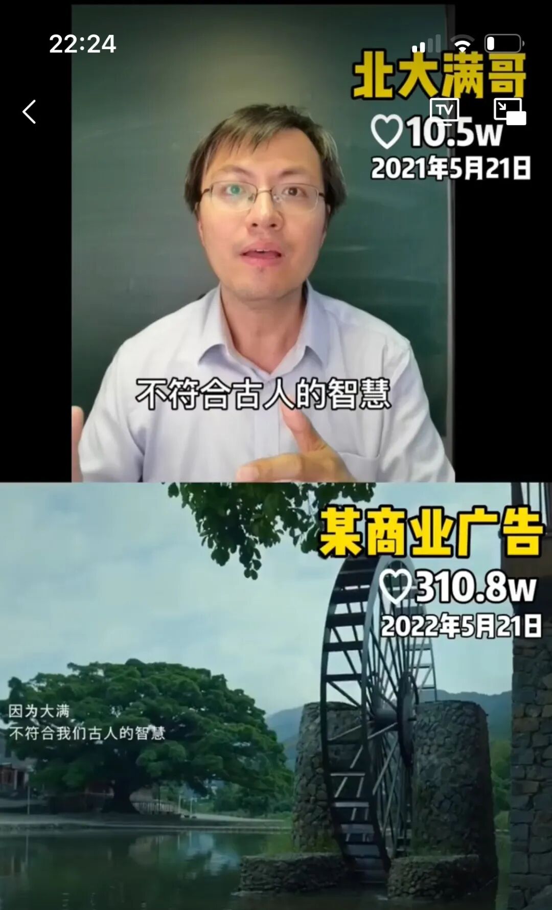 视频里,一位名叫“北大满哥”的抖音博主出现画面上方,他穿着白衬衫,坐在一块黑板前,边做着各种手势,边说:“有小暑就一定有大暑,有小寒就一定有大寒,但是小满一定没有大满,因为大满实际上不符合古人的智慧。”而屏幕下方,就是那支“奥迪小满广告”——刘德华在镜头前,用和缓沉静的声音说着完全同样的话:“有小暑一定有大暑,有小寒一定有大寒,但是小满一定没有大满……”