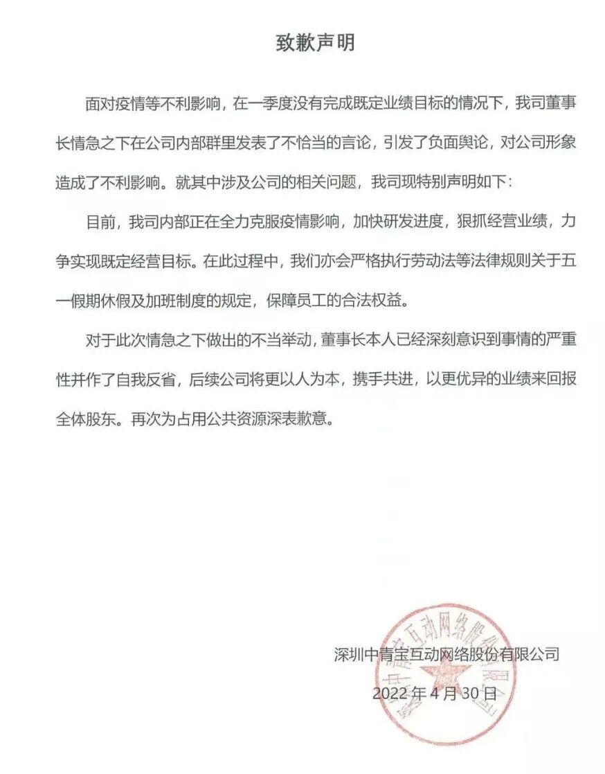 ▲ 中青宝发布的致歉声明。图 / 中青宝官方公众号
