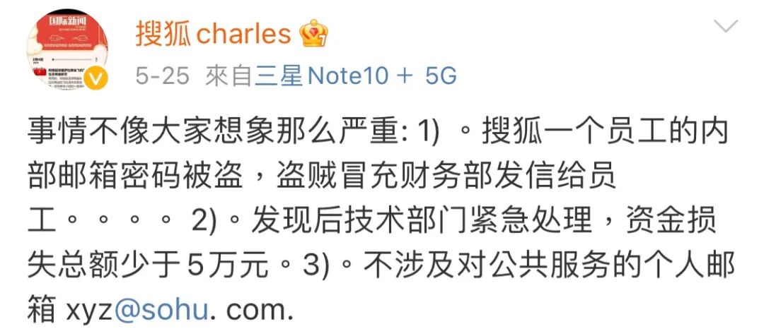 沉迷教物理课的张朝阳,冷不丁被黑客上了一课。他从满黑板的物理公式中抬起头,抽空回复了一下大家的关心,说事情没那么严重,就是一个员工的内部邮箱密码被盗,盗贼冒充财务部发信给员工;损失也没那么大,被骗的钱加起来还不到5万块,也不涉及对公众服务的邮箱。