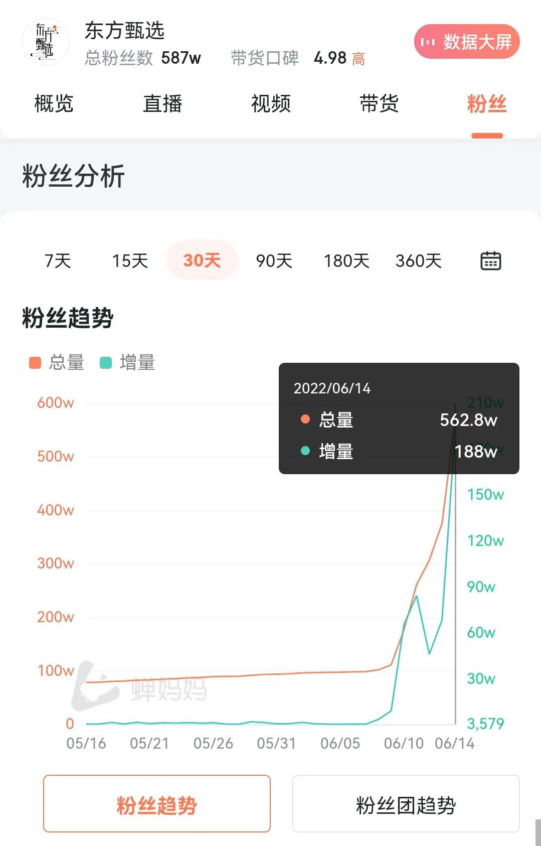 ▲ 东方甄选一日涨粉数百万。6月15日,粉丝量已超过560万达到612万。图 / 网络