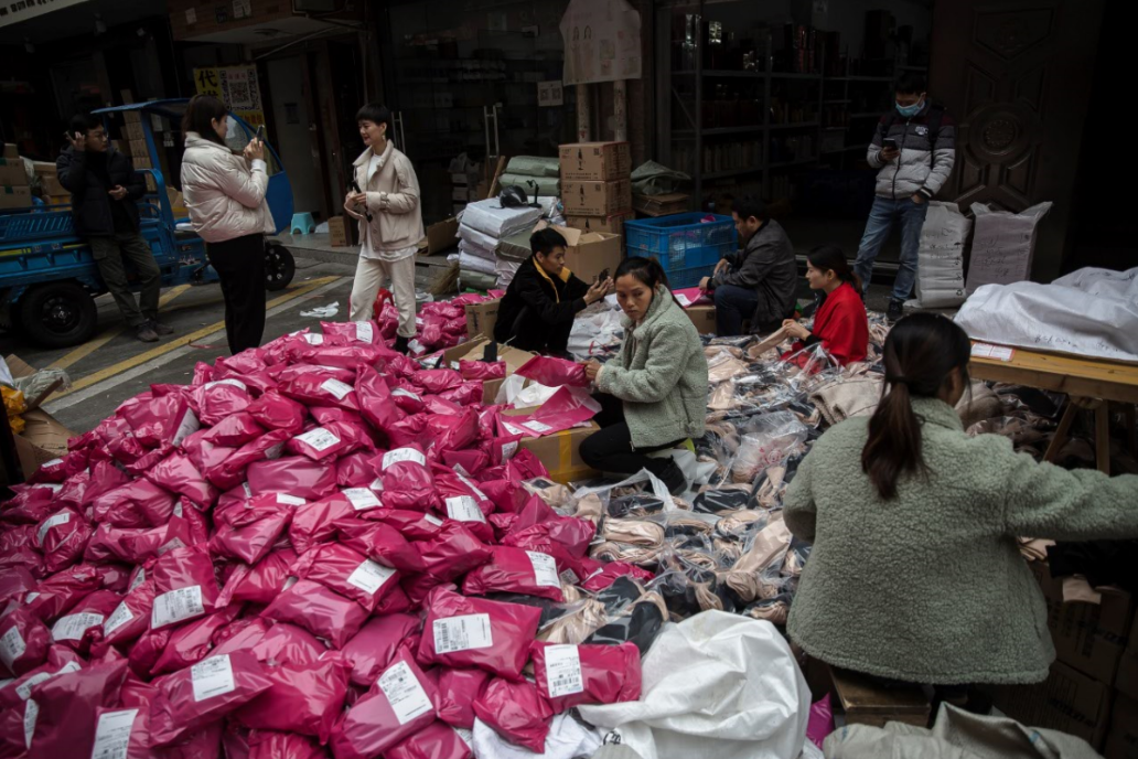 一个外来者,要花上一段时间,才能进入这个网红第一村的生态。二维码是通往北下朱的密码。所有店铺会直接把二维码放在牌子上,进了店铺的门,不管生意成不成,先扫两个码,一个素材号,一个微信号。北下朱到处是撕拉胶带的声音,每天无数货品从这里发往全国。这个村落占有着义乌全国最低价物流的红利。也正是如此,北下朱的商品可以做到九块九,还能包邮。人与人的对话像是开了扬声器。街上的人们用同样的场景表演:女主播坐在豪车上,把几十个红色糖果状的压缩毛巾扔进盆里,大嗓门“威胁”:“九块九包邮!你不买,我把这辆车送给你!”时间久了,连日常说话也要提高分贝。来做主播的甘肃姑娘杨犟犟花了好久才适应这种属于北下朱的嗓音。街道偶尔会堵得水泄不通。路上,时不时会有两个路人突然在路上大声吵起来,旁边一个人拿手机拍摄——他们大概率是在拍段子。
