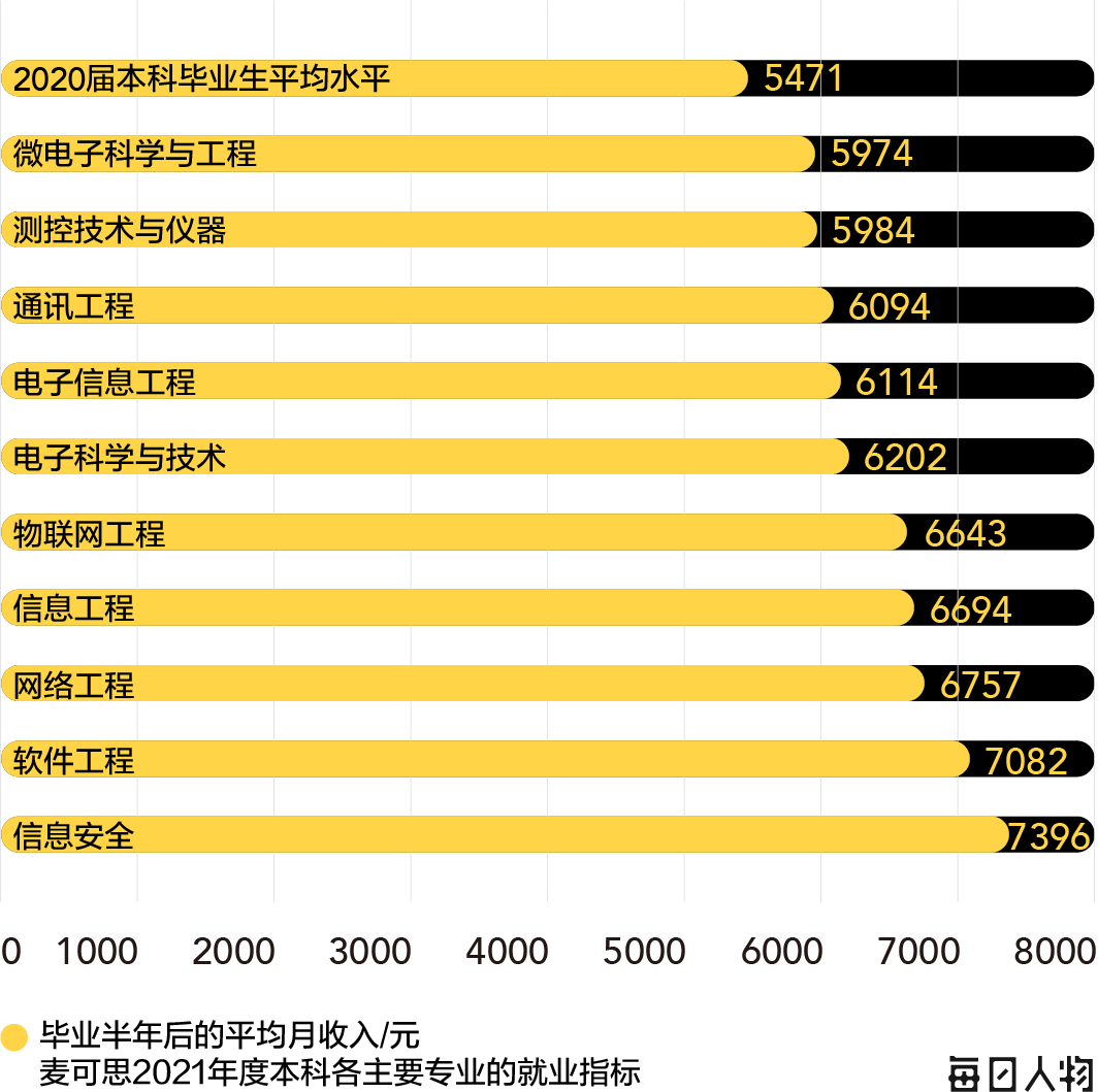 我们可以看到,2020届本科生毕业半年后平均月收入前十的专业中,计算机类专业包揽了前五。排名第一的信息安全专业,平均月收入7396元——不要觉得这个数字低,根据国家统计局统计,2021年我国城镇非私营单位平均每月税前工资为8916元,私营单位为5250元,真的没有那么多月薪过万的打工人。