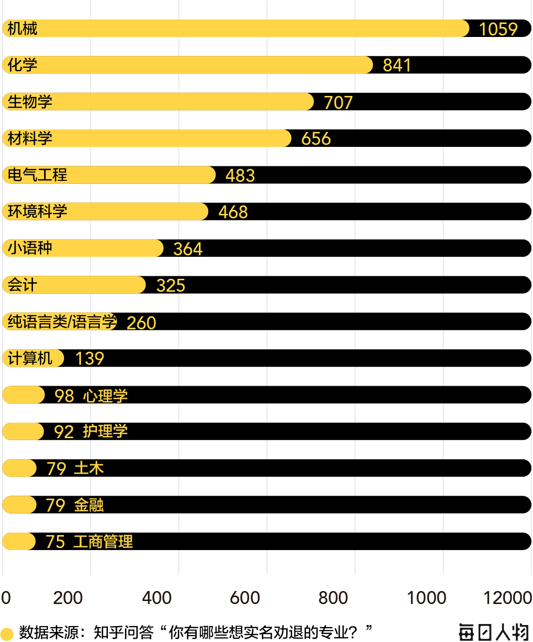 过来的人经验很重要,尤其是被坑过的。打开知乎,能看到很多关于“天坑”专业的吐槽。在热门问题“你有哪些想实名劝退的专业”里,获得点赞量最高的专业分别是机械、化学和生物学。