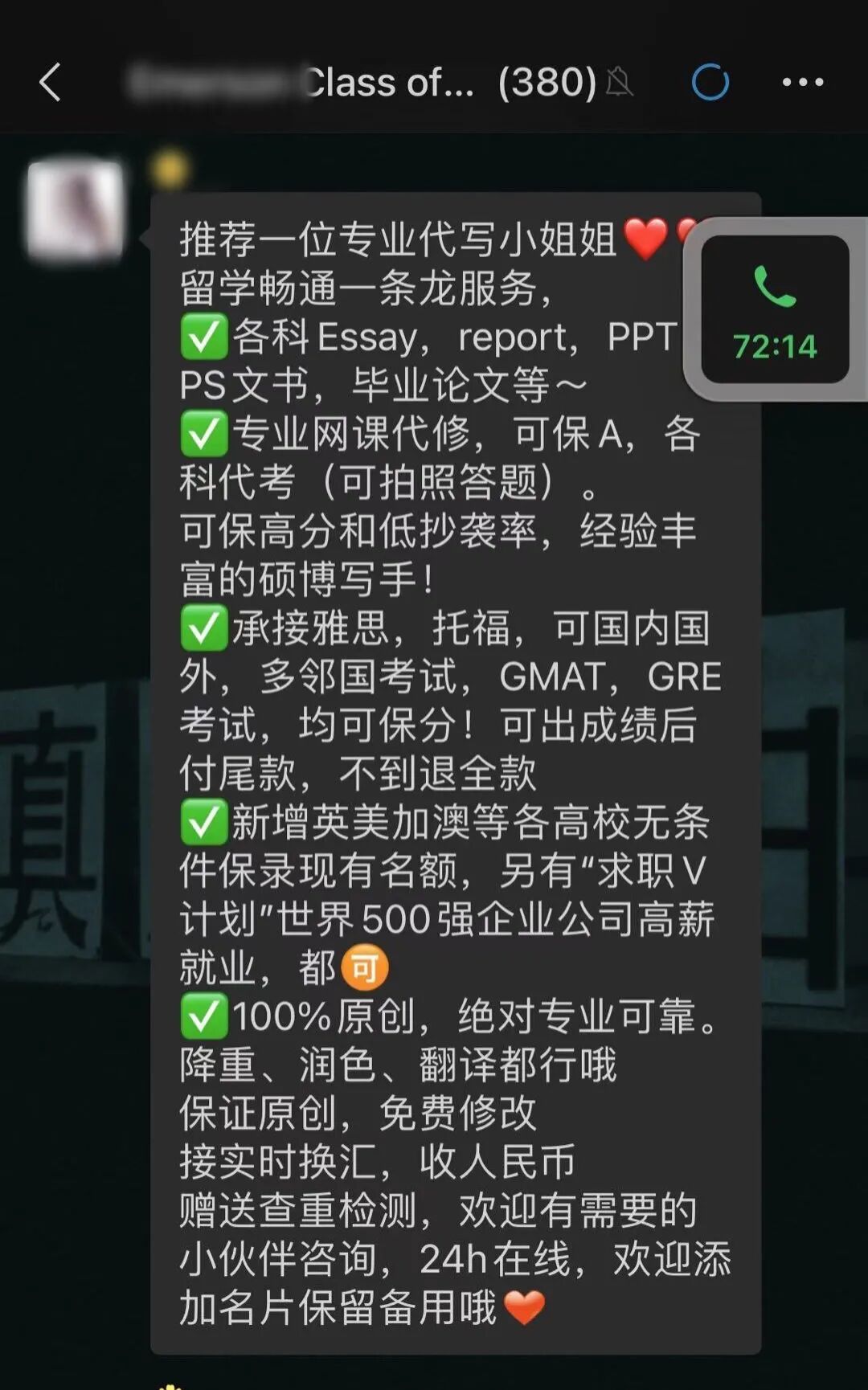 刘赟说,代写其实不是新鲜事,出国之后,自己的Instagram和微信一直有代写中介来添加好友,连十来人的专业小课群里,也会有人混进来发广告。张晨也常常见到网课代管的广告,后来像一场行为艺术,每次有广告出现,她就开始在群里骂“滚”。