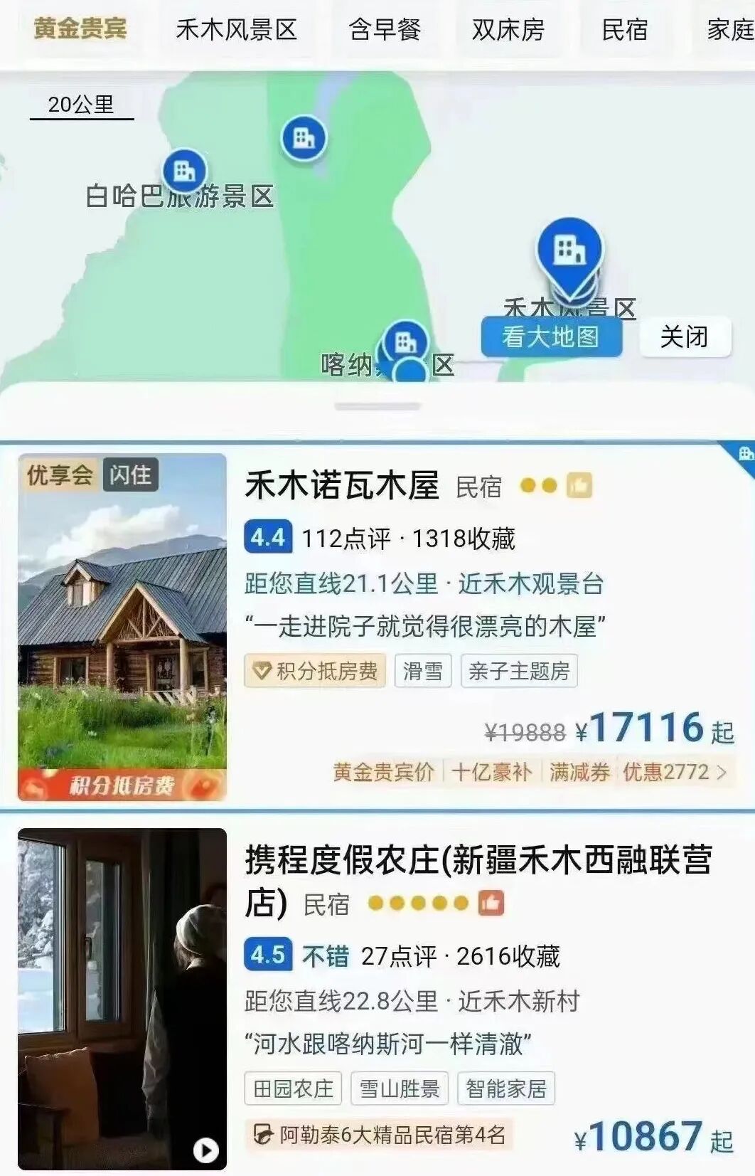 然而,许多多搜索到的两三千,还远远够不上此时新疆最夸张的价格——某旅游App上,同类型的木屋民宿,包含机场接送服务的独栋别墅价格直接飙升到了17000元,另外一家不在景点内的民宿,价格低点儿,也要一万多块。