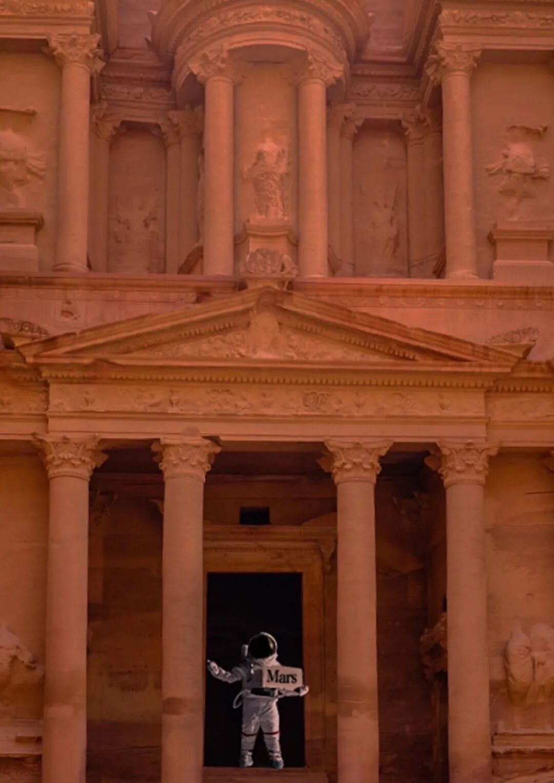 在约旦的佩特拉古城里拍的一张照片,还被悦然拿来完成了一次摄影课的作业。那次老师出的题目是,让以“红色的球”为名完成一幅摄影作品。她想到了以色列那个玫瑰色的教堂,找出当时的照片,在画面中间P了个宇航员上去,玫瑰色的教堂就像是在火星上。而火星,就是一个巨大的“红色的球”。