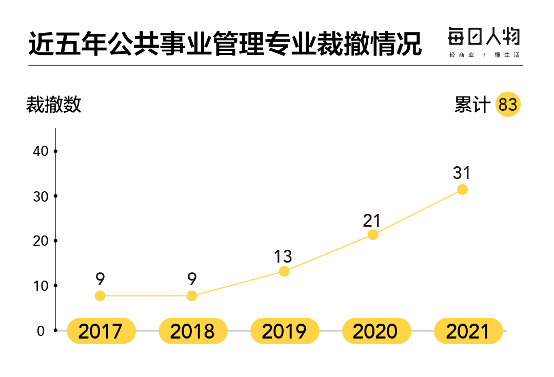 ▲ 从2017年到2021年,公共事业管理累计被83所大学裁撤。作图 / 田伟