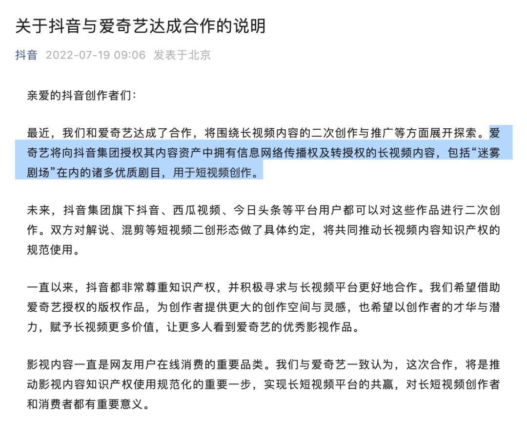 ▲ 抖音与爱奇艺合作声明。图 / 公众号截图